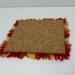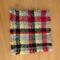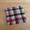 6-inch square felted wool mug rug with a cork back. Woven in a red, gray, yellow and black plaid.