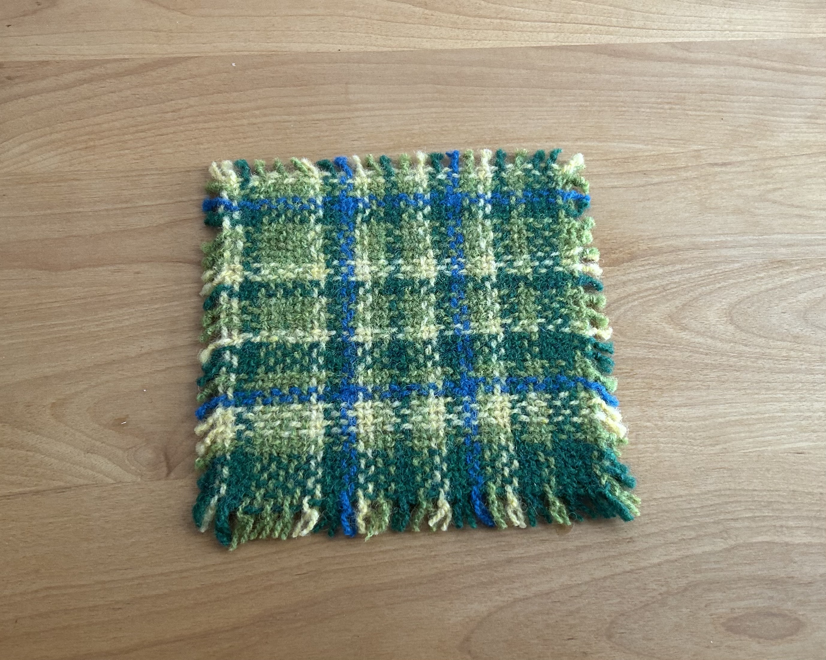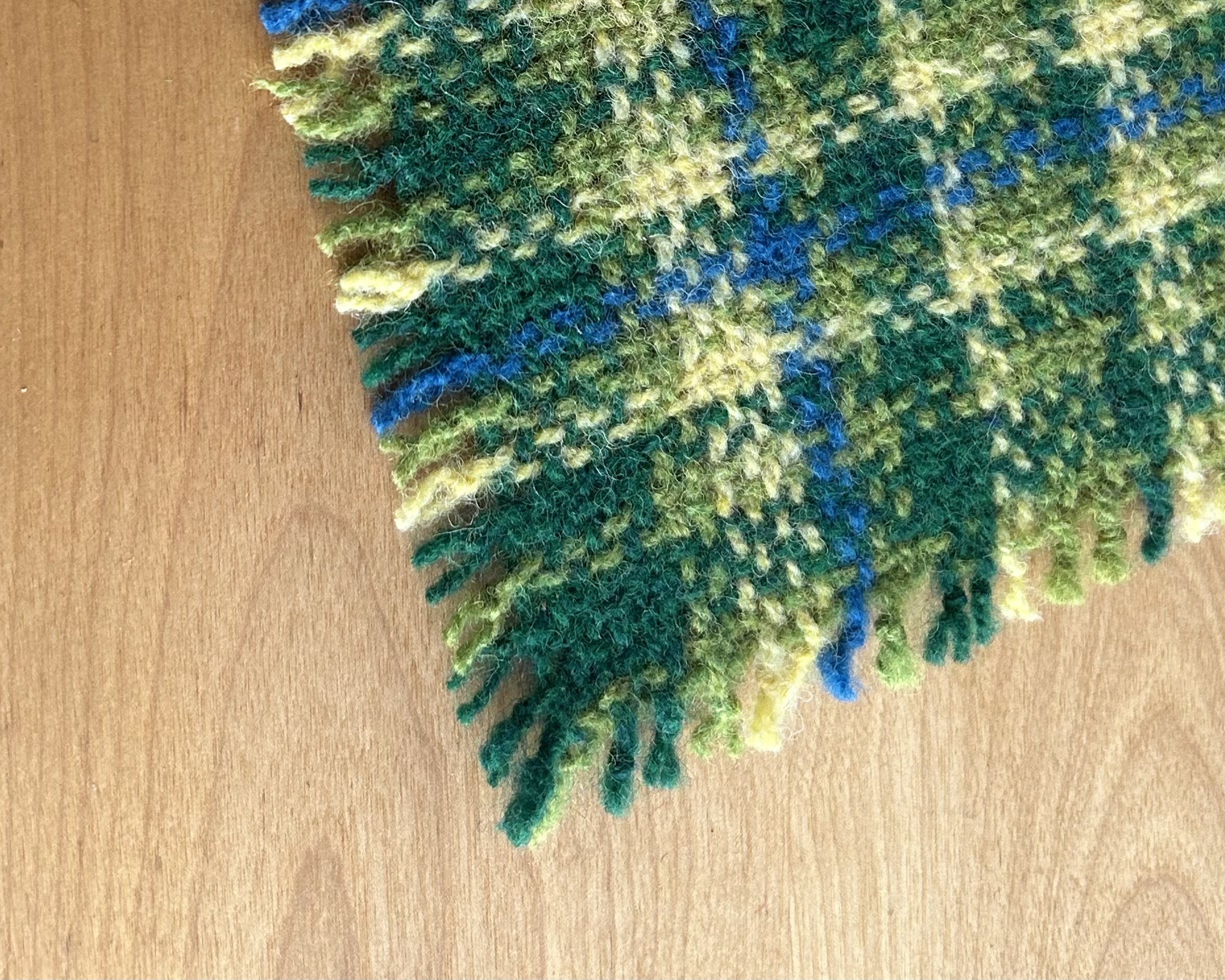 This oversized scrappy wool mug rug is a continuation of my summer of exploring new and old weaving techniques. Additionally, using loom waste from previous projects, these little plaid beauties allow me to adhere to my commitment of using mainly sustainable yarns by using these scraps to reduce my contribution to landfills. In the process, I hope to inspire others to think twice about what they throw away.