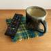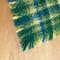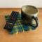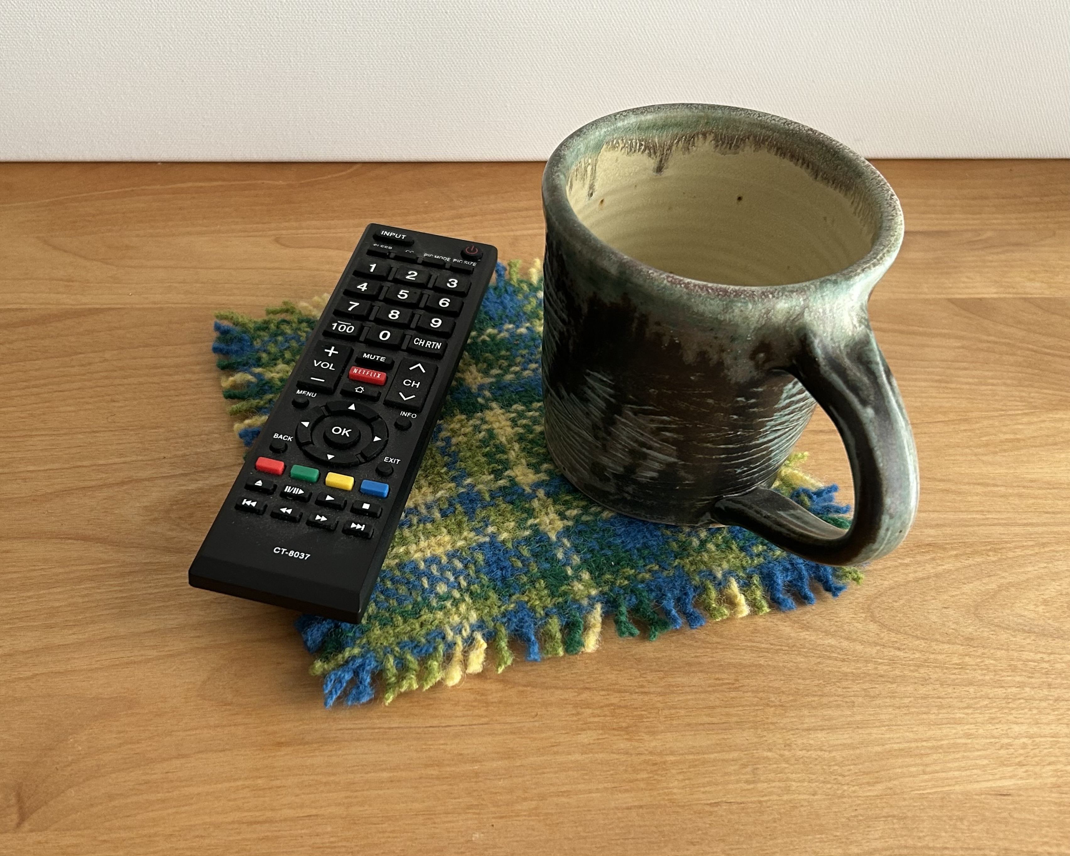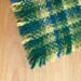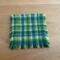 6-inch square felted wool mug rug with a cork base. Gradient study of dark green to yellow plaid with blue highlights