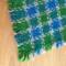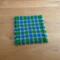 6-inch square felted wool mug rug with a cork base. Woven in a blue, green and light gray check