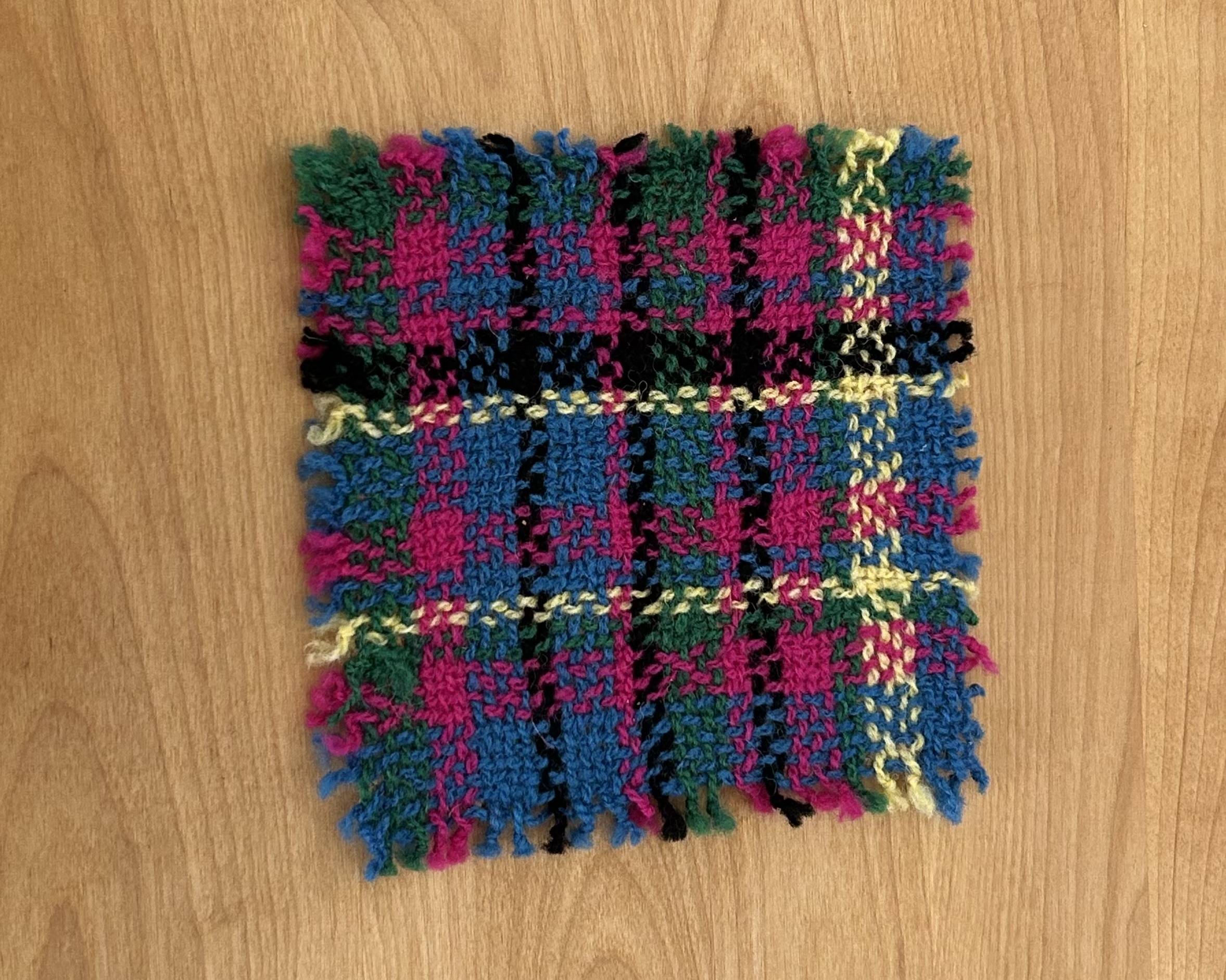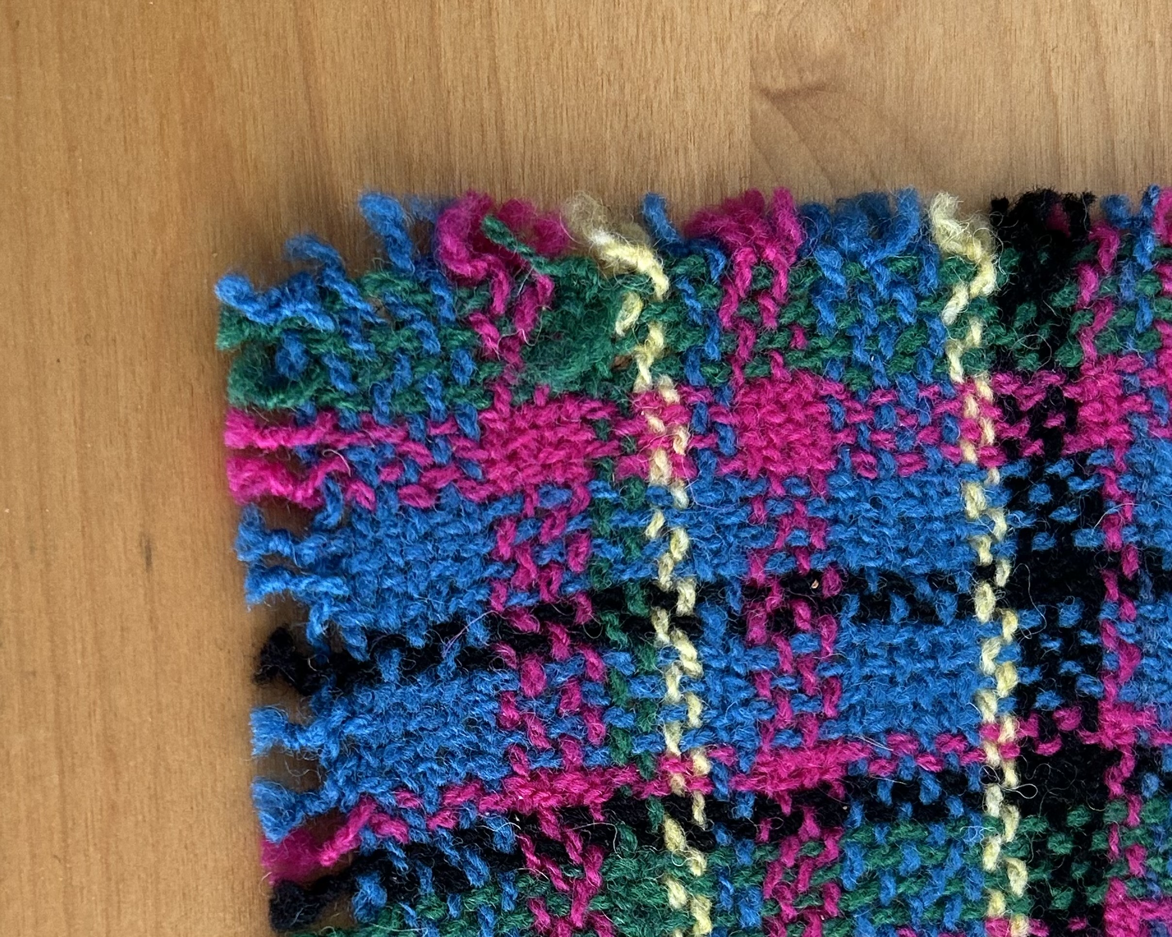 This oversized scrappy wool mug rug is a continuation of my summer of exploring new and old weaving techniques. Additionally, using loom waste from previous projects, these little plaid beauties allow me to adhere to my commitment of using mainly sustainable yarns by using these scraps to reduce my contribution to landfills. In the process, I hope to inspire others to think twice about what they throw away.