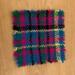 6-inch square felted wool mug rug with a cork base. Woven in a blue, pink, black, green, and yellow plaid