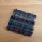 6-inch square felted wool mug rug with a cork base. Woven in a dark gray, yellow, black and red plaid.