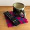 Spot clean with a damp cloth as needed. I have been using mine non-stop and have found it easily accommodates a mug of coffee and large glass of water. It also allows me to have a glass of water and the scissors and seam ripper I'm using to remove the hems from rescued bedsheets that will be used for future table runners and rugs. TV remotes, cell phones, crochet hooks, knitting needles and small snack bowls are just some of the many objects that could share space with your favorite beverage.