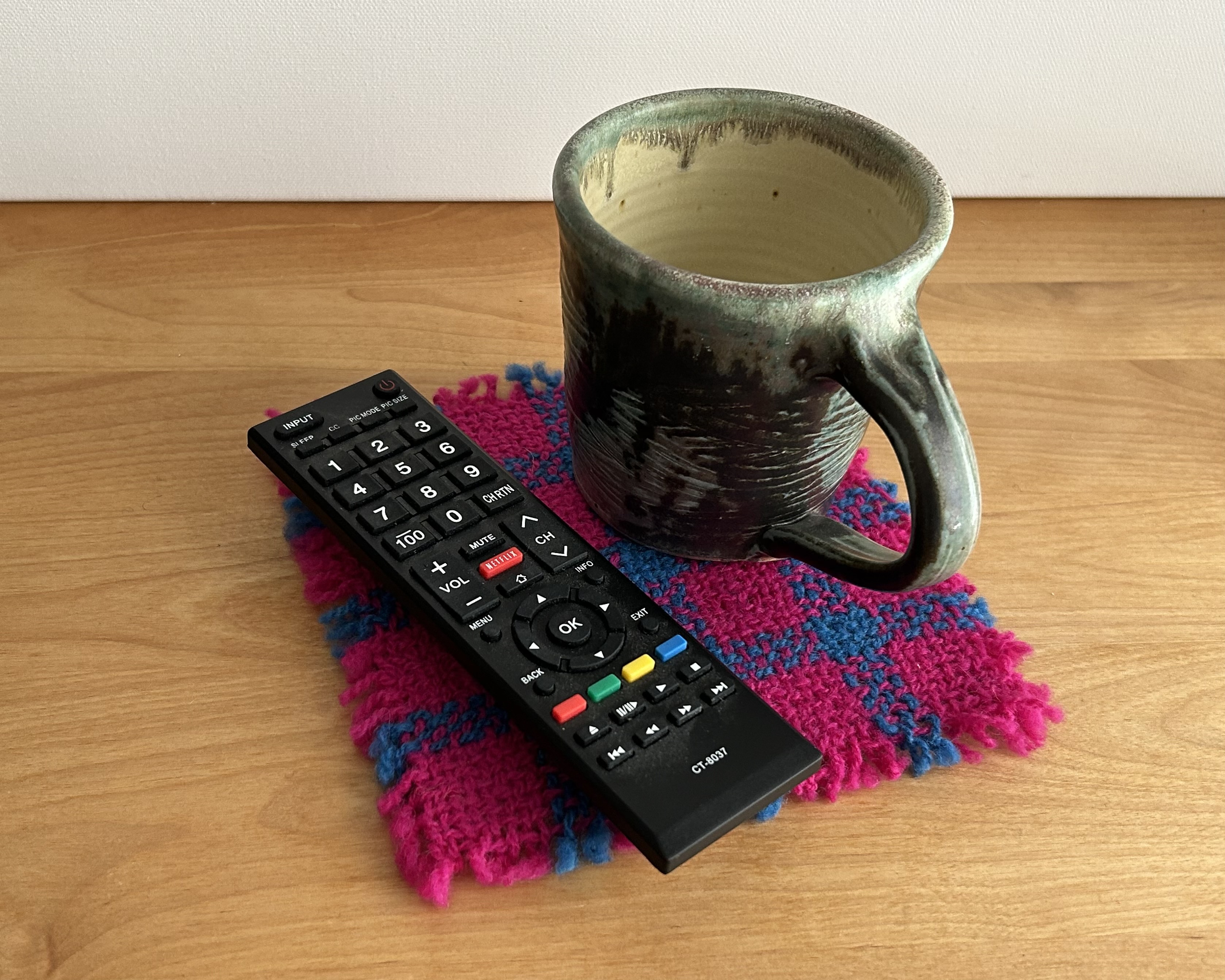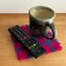 Each mug rug was woven on a small sampler loom as a 9-inch square and then felted by wet finishing in hot soapy water. Using quality wool is the secret to these pieces consistently shrinking from nine inches to six inch squares.