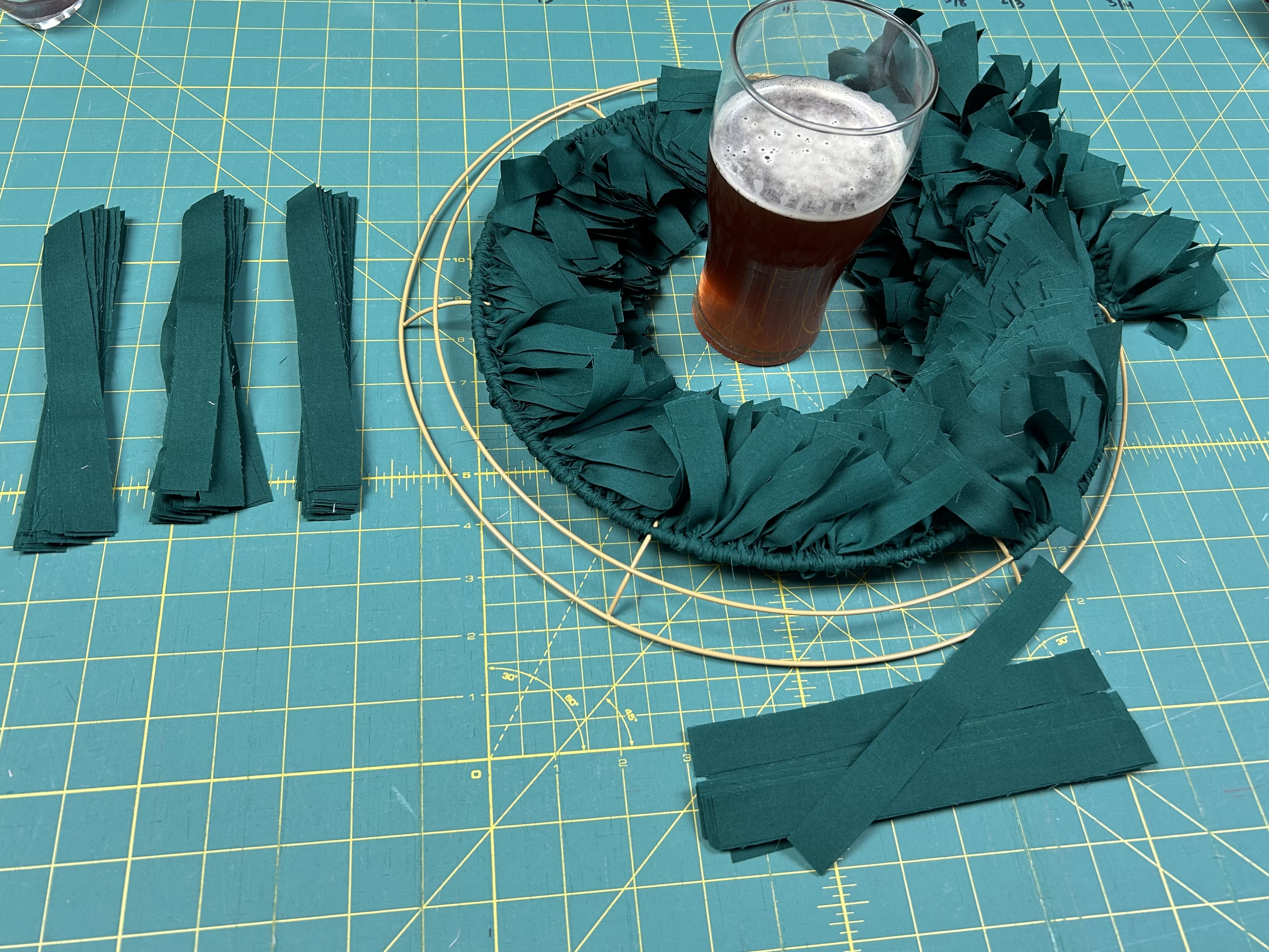 Measuring and cutting the fabric is the most time consuming part of making these wreaths and doesn't really lend itself to a group activity. Attaching the fabric to the frame takes time but doesn't require your undivided attention, so there's plenty of time to chat with your friends or kids and enjoy each other's company.