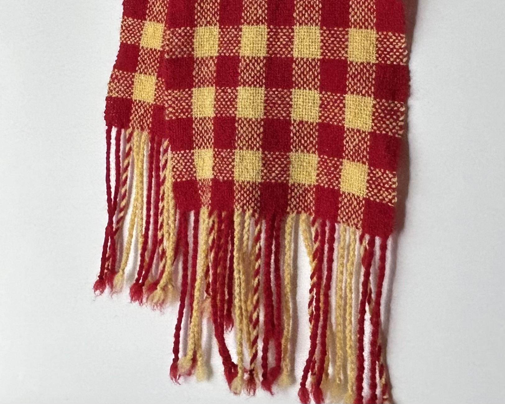 This extra long cozy scarf was envisioned for winter sports spectators and participants alike. Woven in a classic check pattern, let this bright red and yellow scarf declare your team loyalty.