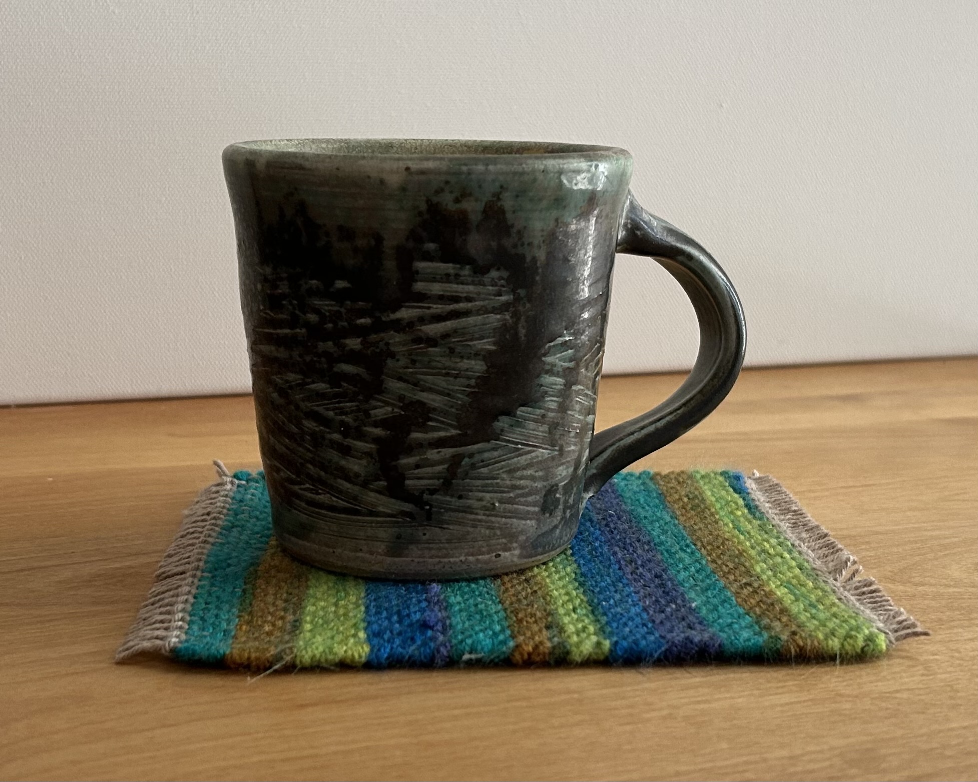 Woven on my smaller rigid heddle loom using tan 8/4 rug warp and a self-striping acrylic yarn these little 5-1/2 by 5-3/4 inch rugs with a short fringe, resemble throw rugs.
