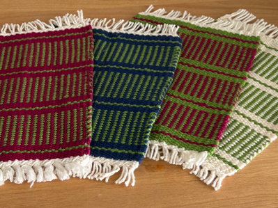 This summer I have been experimenting with different weaving techniques and re-visiting some I haven't used in a while. This set of four approximately 6-inch by 4-3/4-inch (not including fringe) mug rugs, were handwoven by me on my small rigid heddle loom, using a weft faced technique that essentially hides the warp yarns except for the fringe. This technique takes more time than a balanced weave due to beating each weft throw with a tapestry shuttle to completely hide the warp.
