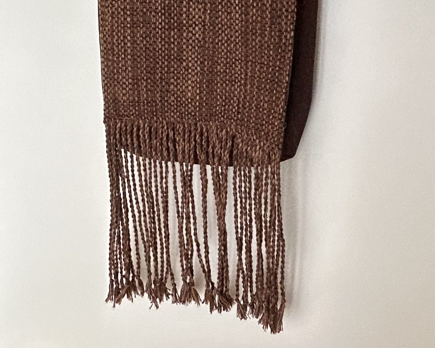A story, a fairy tale if you will of making lemonade out of lemons. This piece was originally to be a warm cozy scarf with lots of drape, texture and fluttery fringe; however somewhere along the way the tension on one side of the loom went AWOL and the resulting scarf had a slight but definite curve. As this piece had been an experiment using yarn from a local purchase of seven partially used cones of fine cotton and acrylic yarn in various shades of brown, plus some chenille I had on hand the time required to try and correct the curve was not practical.