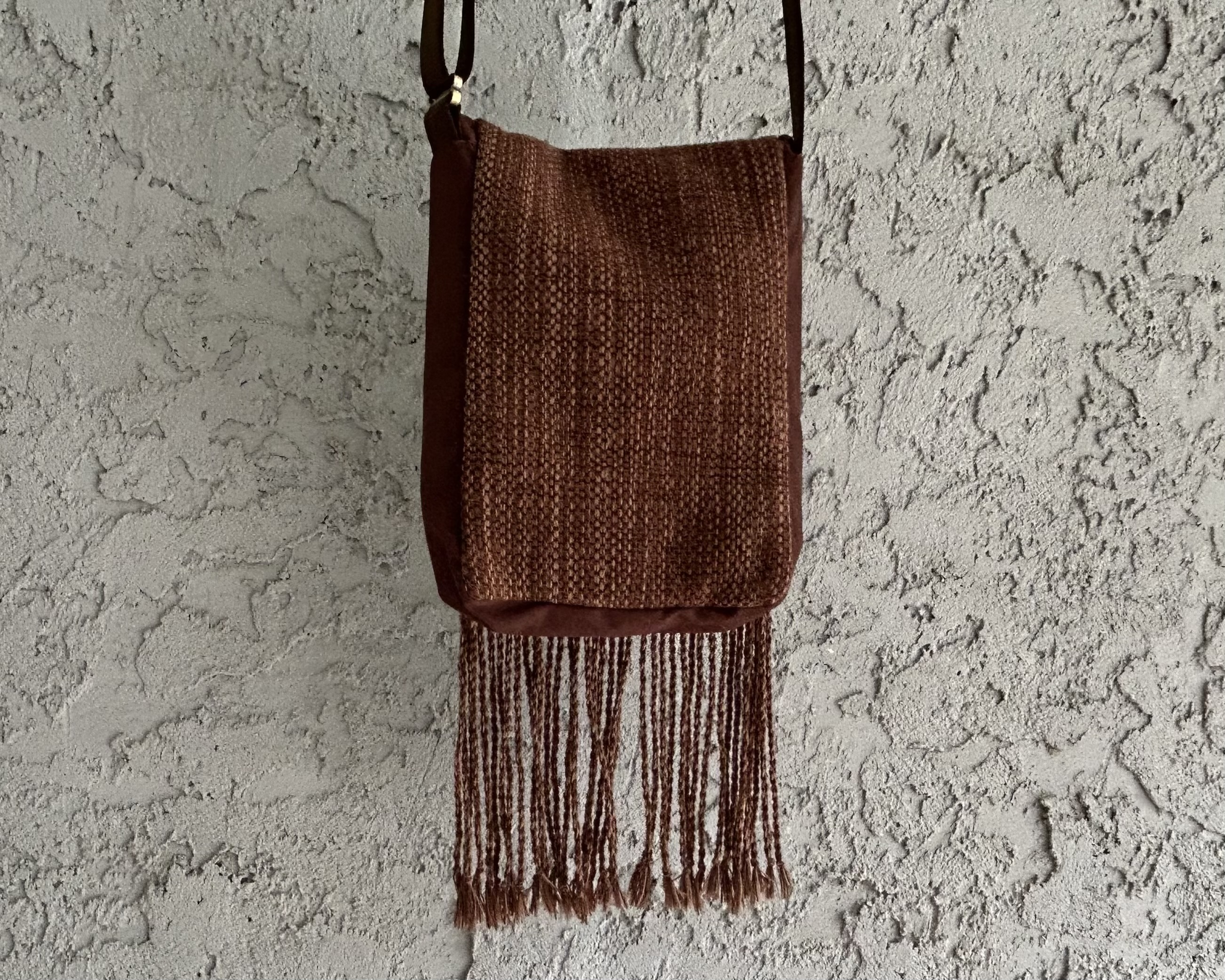 This small to medium sized shoulder bag or crossbody purse showcases a piece of my hand-weaving on the back and front flap, including 8-1/2 inches of hand twisted fringe.