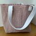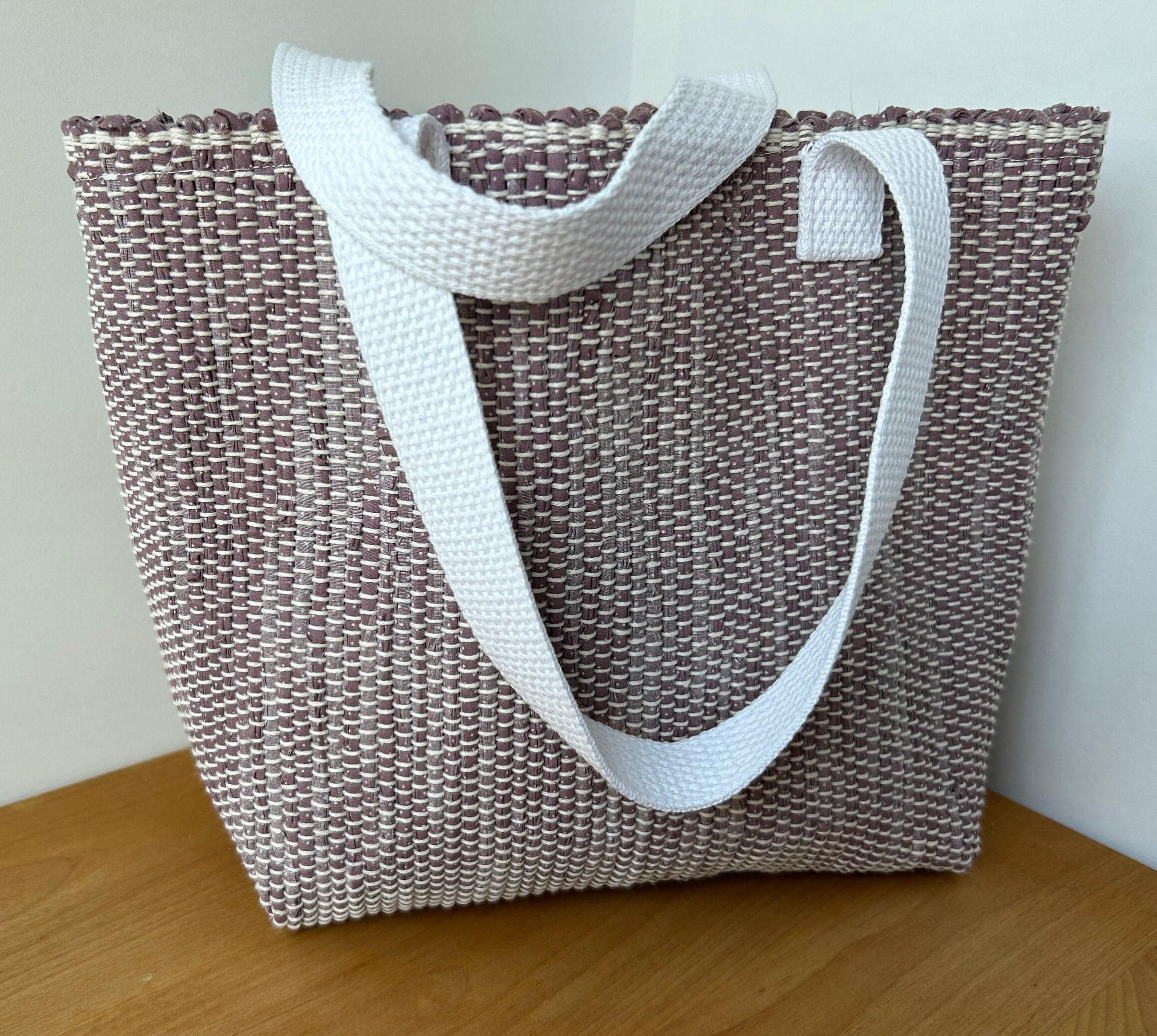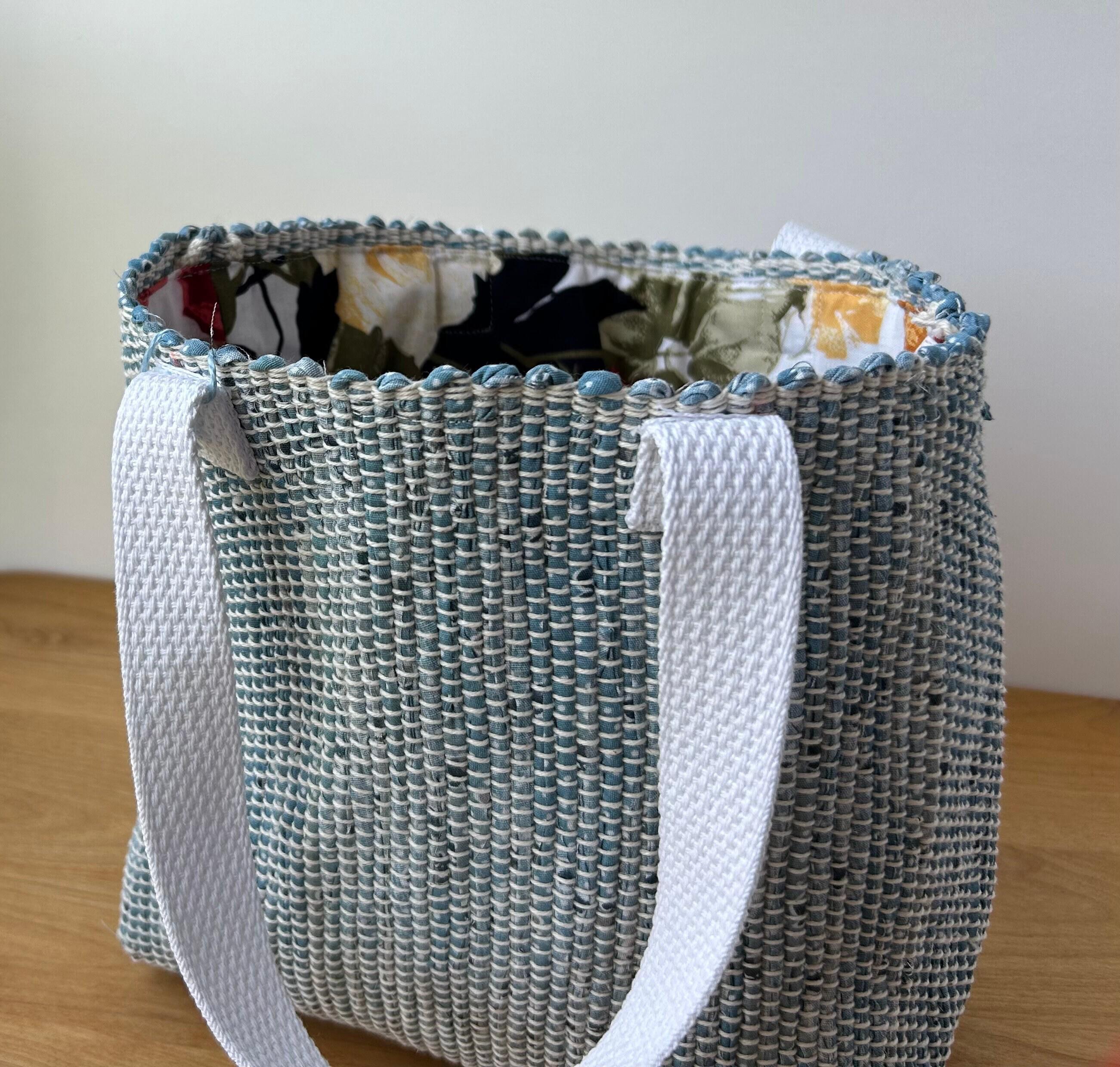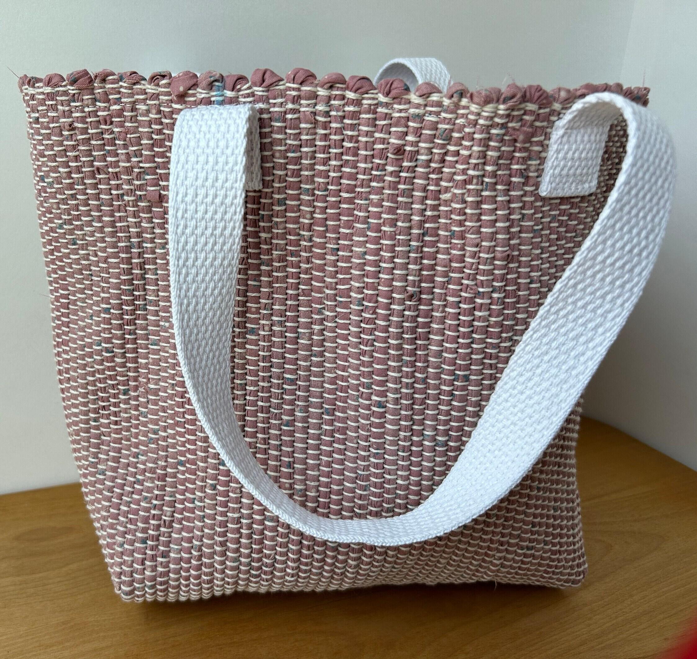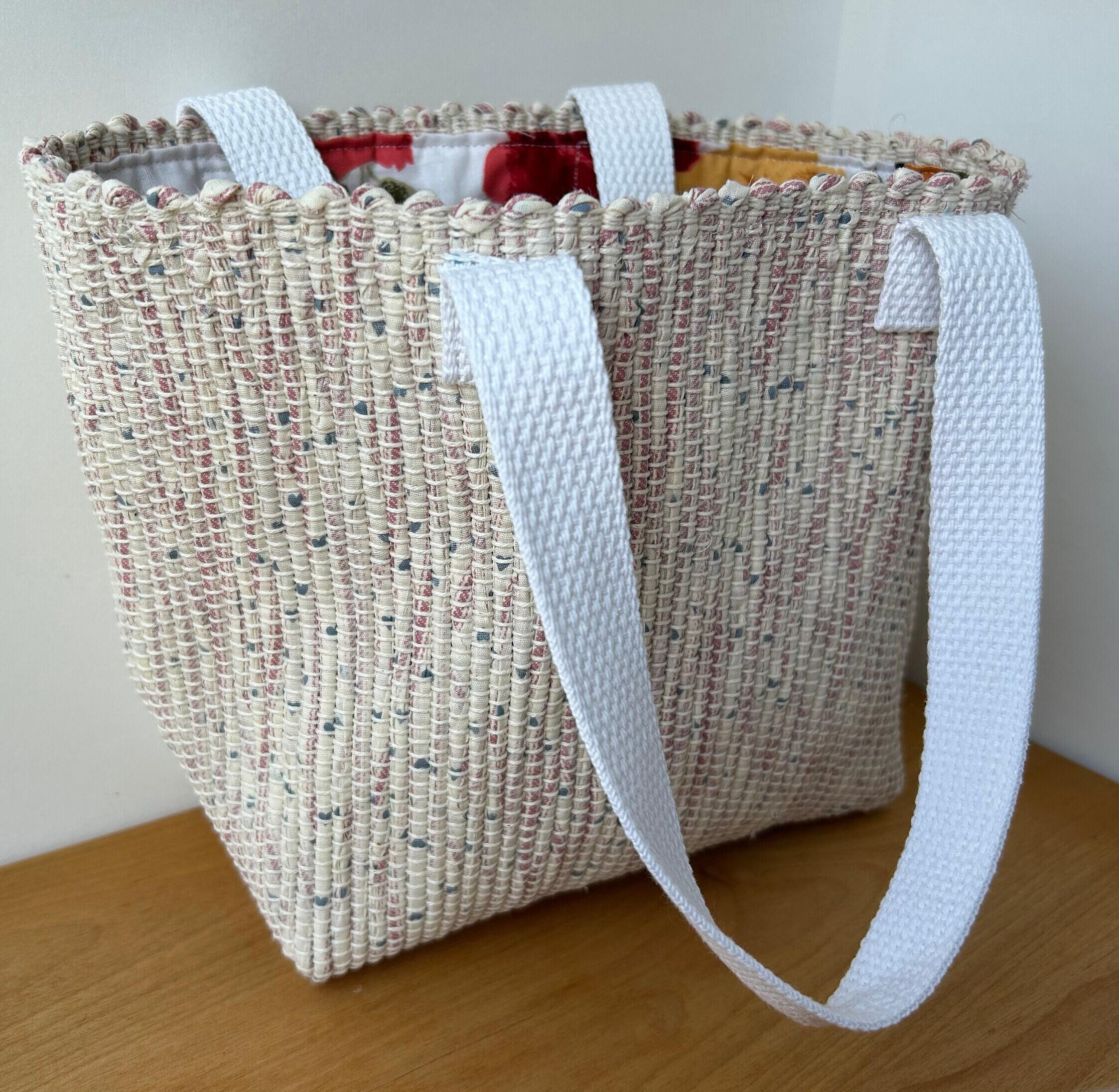 The first of these cute little bags were the result of having more weft (cotton fabric) than needed for the project I was working on, but I still had warp on the loom and no clear idea what to do with this leftover fabric. So, I just kept weaving until I ran out of weft, resulting in an approximate square. As with most unplanned results like this, the fabric had to sit on a shelf for a period of time until inspiration struck. As it turned out I had some short pieces of webbing left from making tote bags and the color worked with this square of woven fabric patiently waiting to see how it would be repurposed. There was no lining for the first of these two little bags that were simply leftover weft that didn't go with anything else in my inventory at the time, but they were snapped up an even referred to as whimsical in one review.