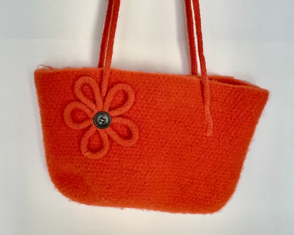 This unlined felted wool shoulder bag measures 10 inches wide and 11 inches tall with double shoulder straps. Using a vibrant orange 100% wool this bag was stitched in single crochet in an oblong continuous piece, felted and the felted straps and flower decoration added.